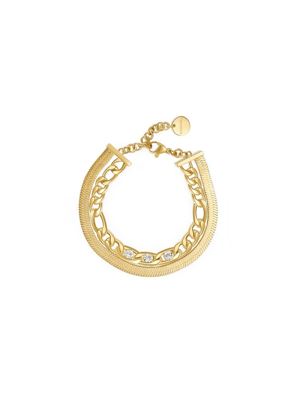 Ženska narukvica SYMPHONIA BYM112 od nerđajućeg čelika u boji žutog zlata, pljosnata narukvica "snake" i karike sa cirkonima.